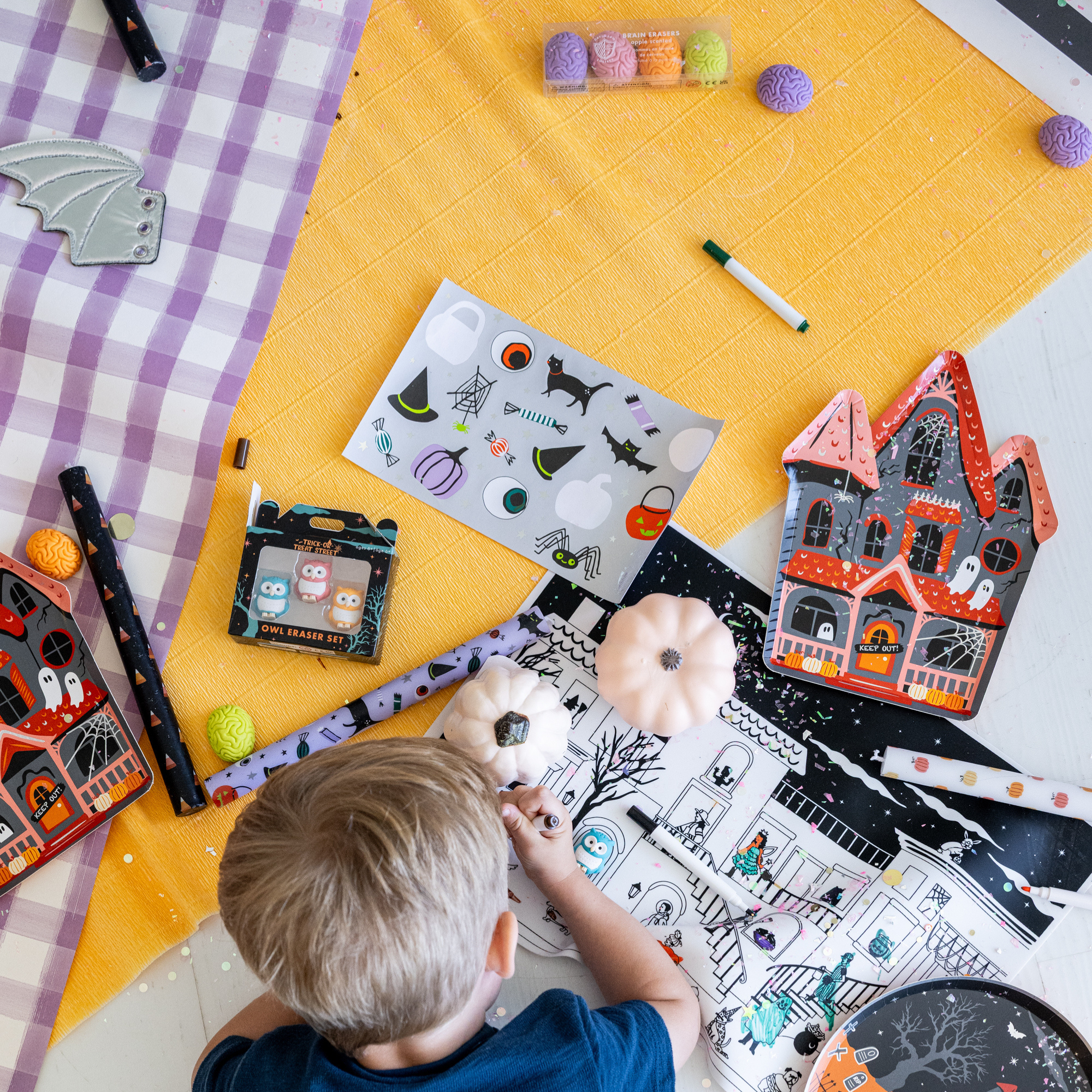 Color in a haunted scene again and again! This wipe-clean silicone mat features a detailed spooky house and is perfect for creative little monsters.